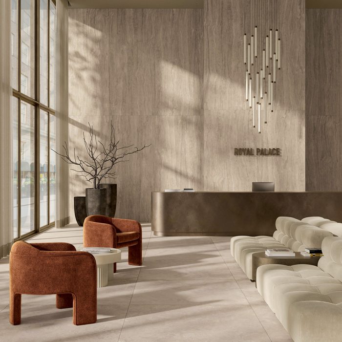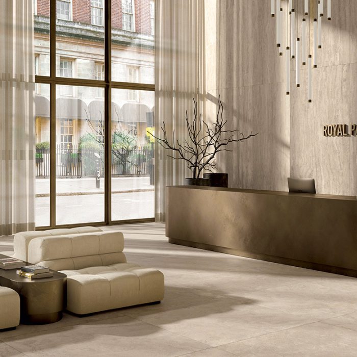 Meet Travertine Sense, a collection of porcelain surfaces that boast a natural, earthy aesthetic that aligns perfectly with the growing demand for biophilic design and organic materials in interiors. Soothing, neutral tones and authentic textures bring tranquillity and warmth to modern spaces. Drawing inspiration from the subtle shades of travertine stone, this range offers seven delicate hues, each telling its own story of historic beauty. The stone’s distinct veining and natural patterns add character and elegance to any space, making it a luxurious choice for floors, walls, and countertops. Choose from Cross or Vein cut, or the decorative Wave option to add further interest through texture and shade. Versatility is at its core, as the collection features different formats, from impressive large slabs to functional Grip finishes. This versatility allows it to be used in various applications, from statement walls to minimalist flooring. With natural variations and three decorative options, Travertine Sense can be used across multiple surfaces for unity, where everything in the design works together to create a cohesive whole. Whether indoors or outdoors, these surfaces seamlessly integrate into a range of spaces.