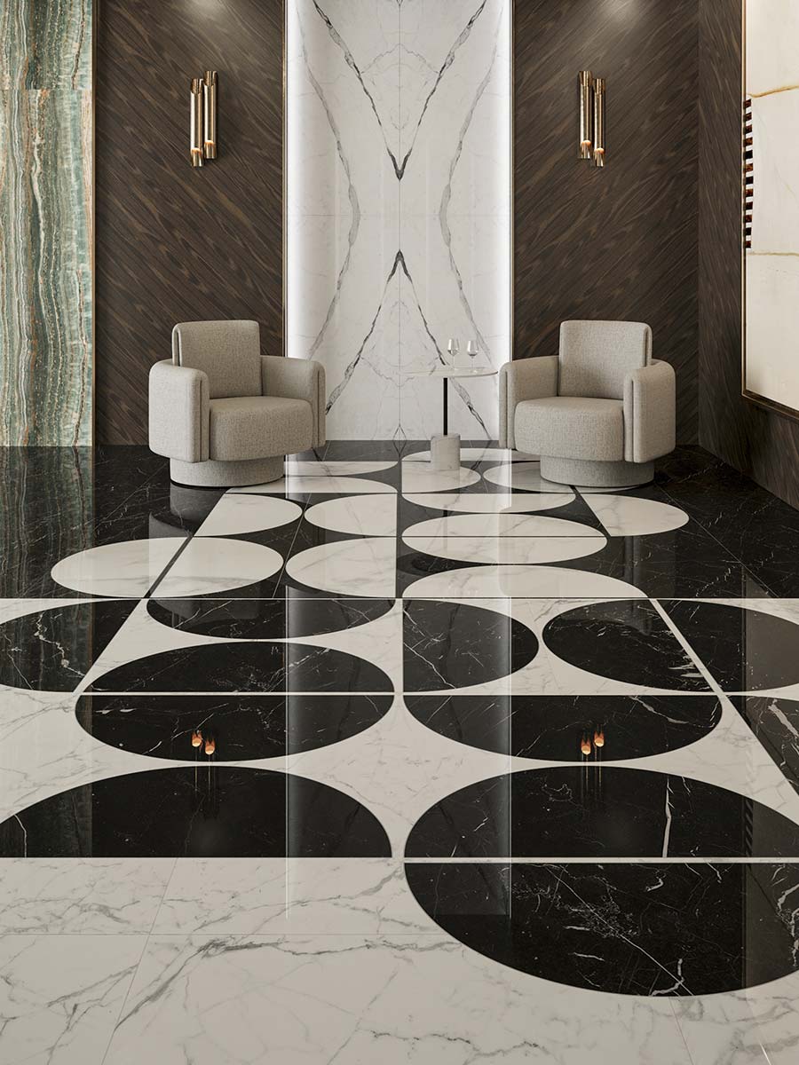 Create unique and visually stunning flooring designs on a larger scale by leveraging the full size and aesthetic appeal of large format slabs. Longer runs provide a seamless design with fewer grout lines. With our cut- to-size services, you can experiment with geometric patterns and curves to create your own bespoke cosmati flooring designs. Suitable for large scale projects spanning several hundred square metres, to a single inlaid floor for an entrance lobby, designs can be created for any style, from contemporary to classical. Geometric designs can be used to create intricate patterns and shapes, while curved designs can help with spatial zoning.