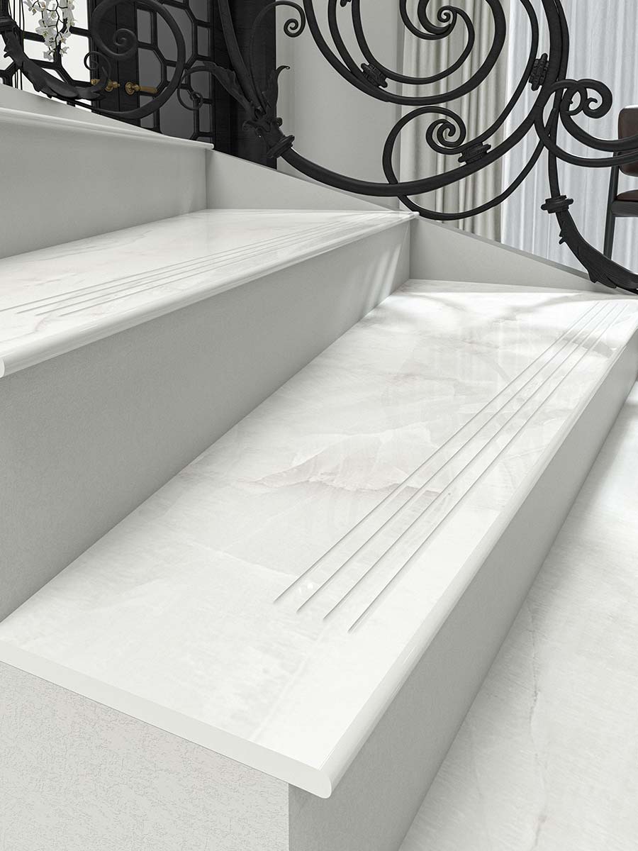 Contemporary staircase design embraces clean lines and innovative materials. Through our cut-to-size services architects and designers can now exploit the beauty and practicality of porcelain slabs to explore every facet of stair design including steps, treads, nosing, risers and handrails. We provide solutions for commercial and residential projects, and offer surfaces that are suitable for both internal and external spaces. Use cut-to-size steps for projects of any scale, from a single step within a split-level scheme, to a full stairwell design, while our expertise and support ensure that your project is completed on-time and on-budget. Both cladded treads and profile edge steps are possible and all can be supplied with matching skirting and wall tiles. For accurate specification we recommend our onsite laser templating service to ensure the precision and fit.