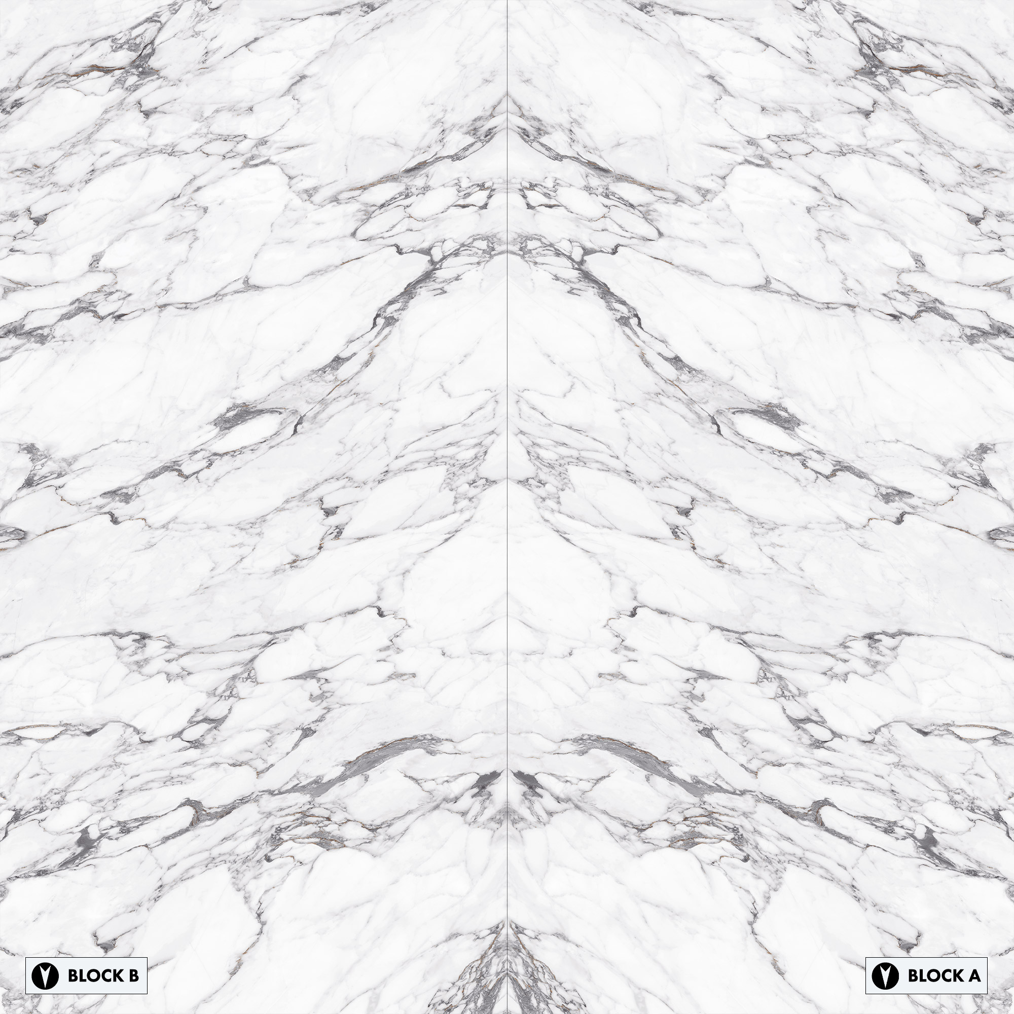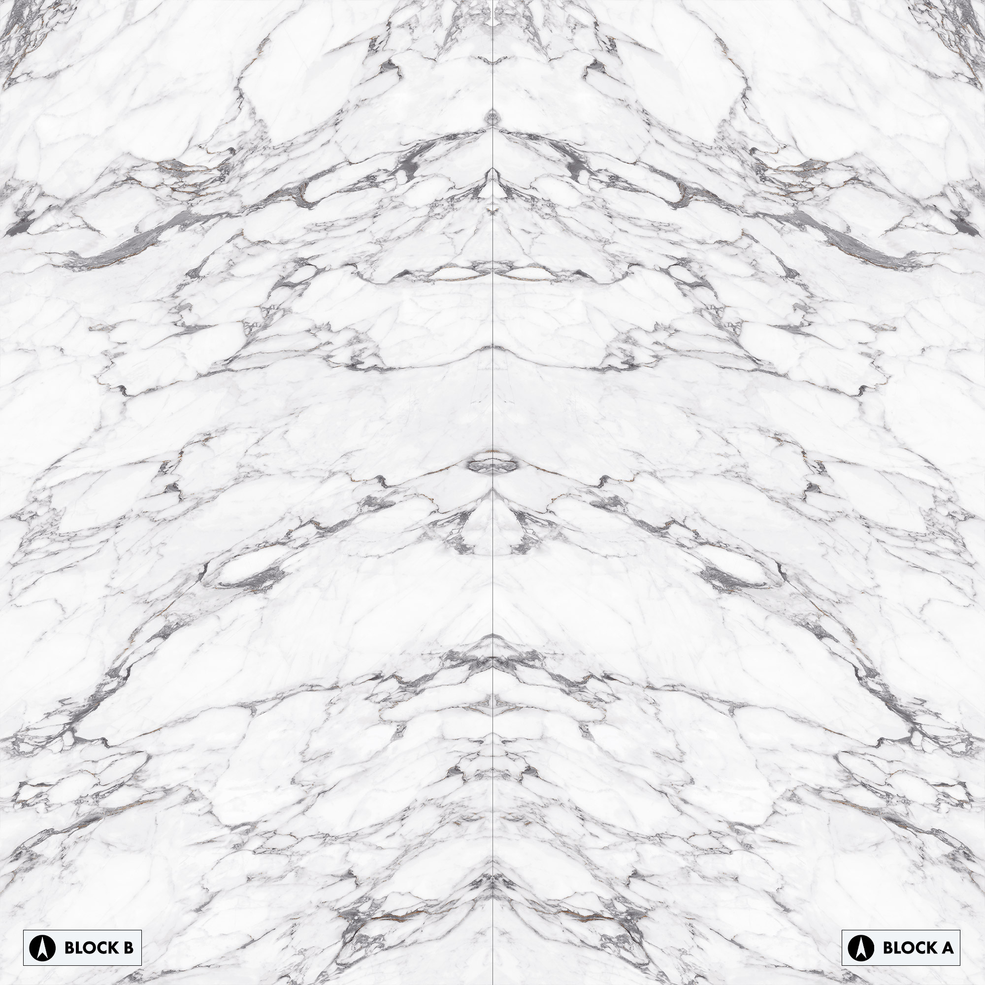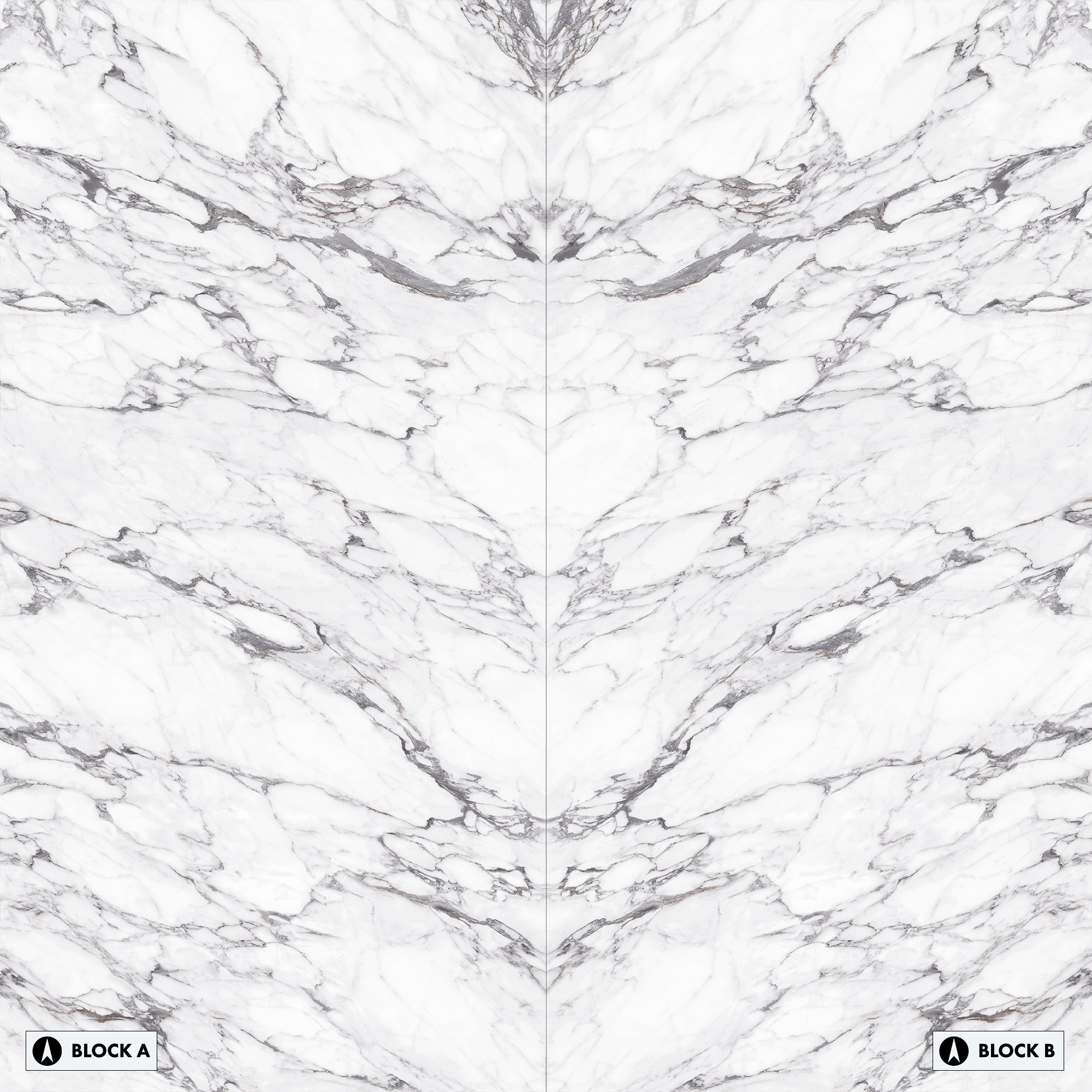 Bookmatched slabs are typically supplied in "Block A" and "Block B" matching surfaces, the pattern of which mirror each other. Below you will find layout options for Arabescato White Bookmatched. The layouts have been prepared to help you understand which Block, A or B is used to create each combination and which direction the block is facing, north or south. Click on each thumbnail for a closer look.