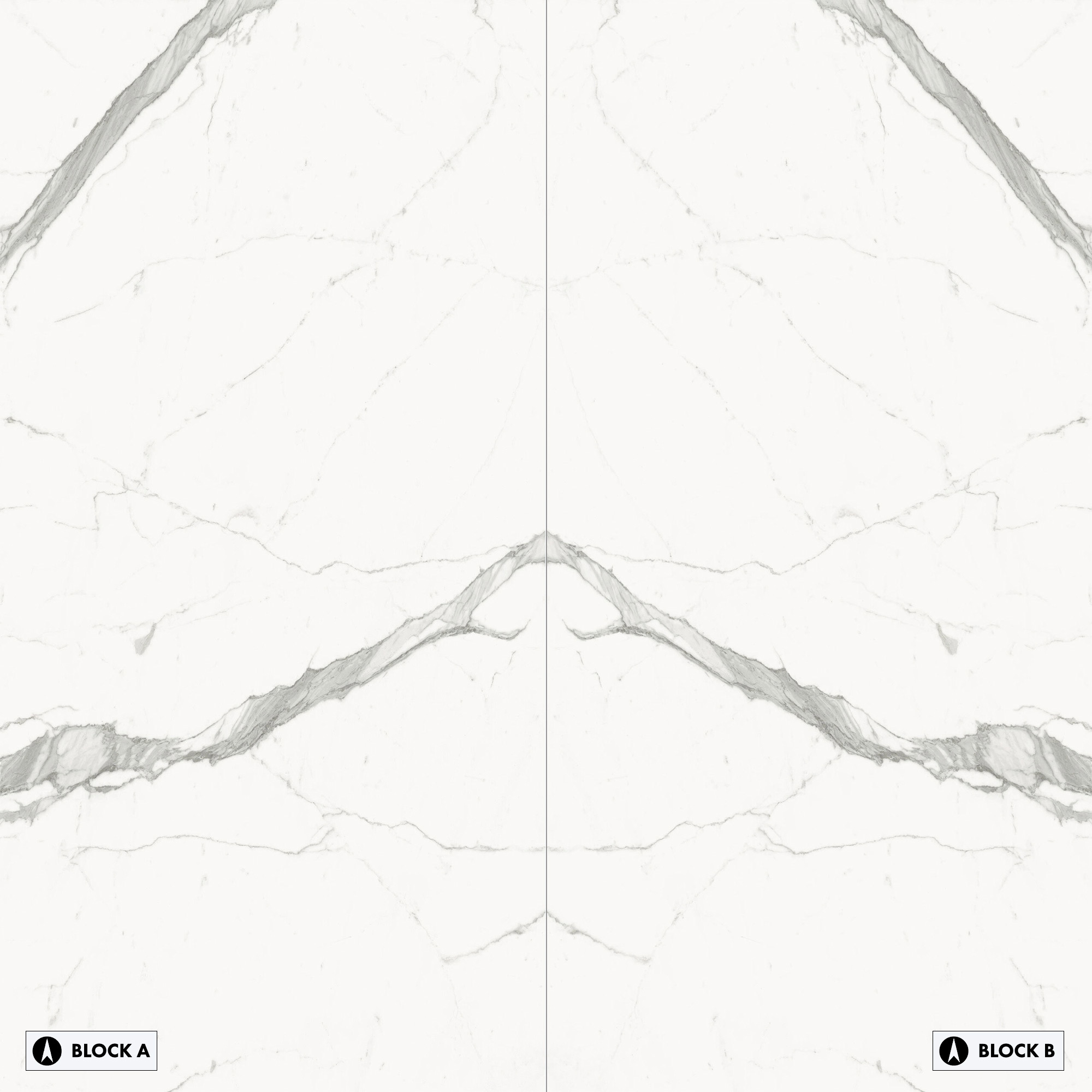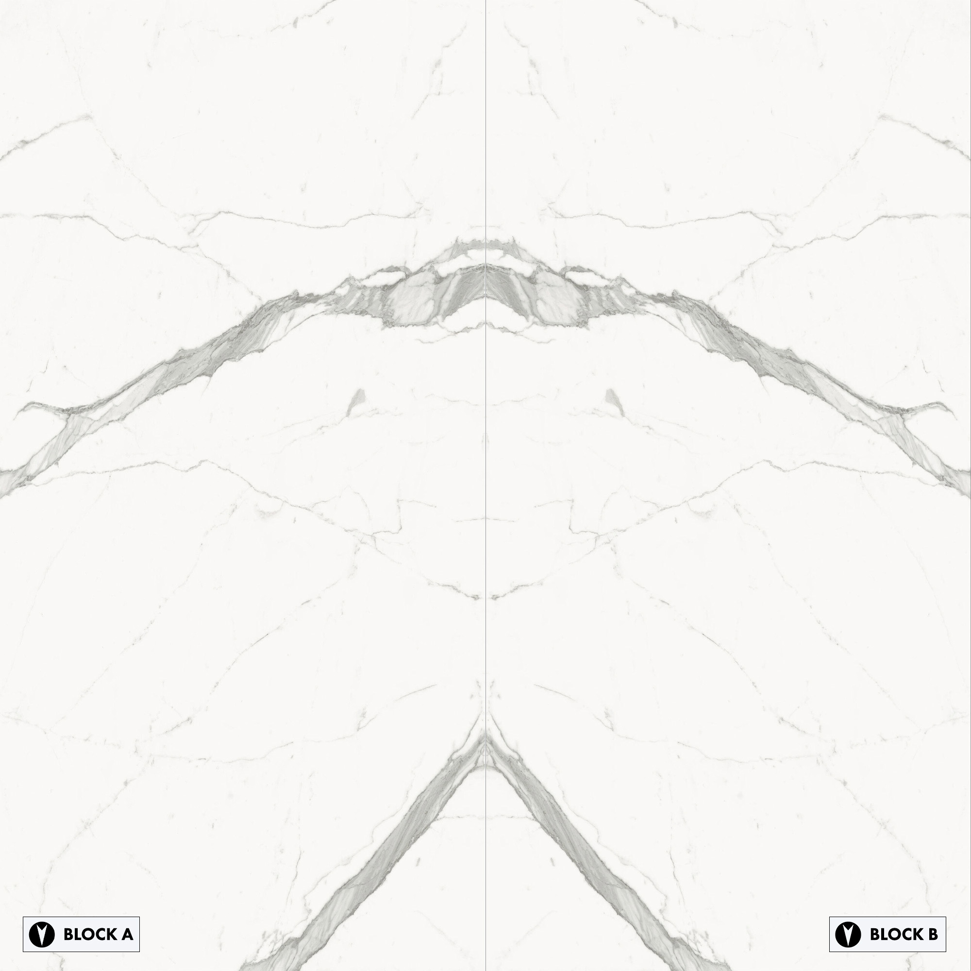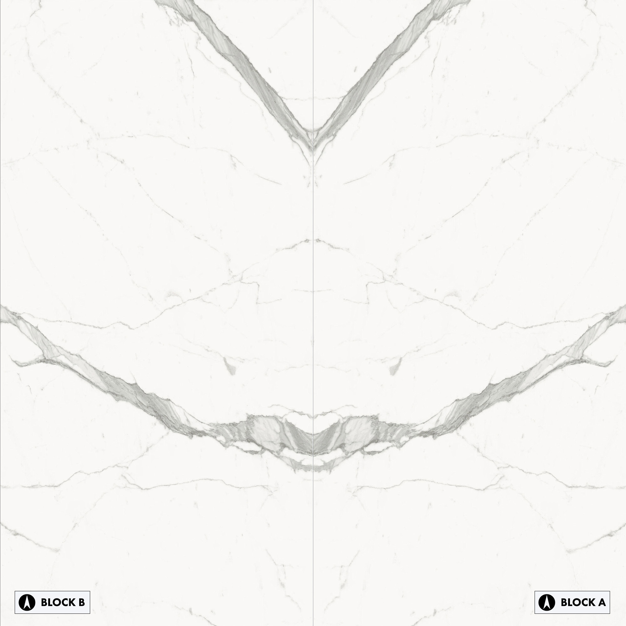 Bookmatched slabs are typically supplied in "Block A" and "Block B" matching surfaces, the pattern of which mirror each other. Below you will find layout options for Bianco Venato Bookmatched. The layouts have been prepared to help you understand which Block, A or B is used to create each combination and which direction the block is facing, north or south. Click on each thumbnail for a closer look.
