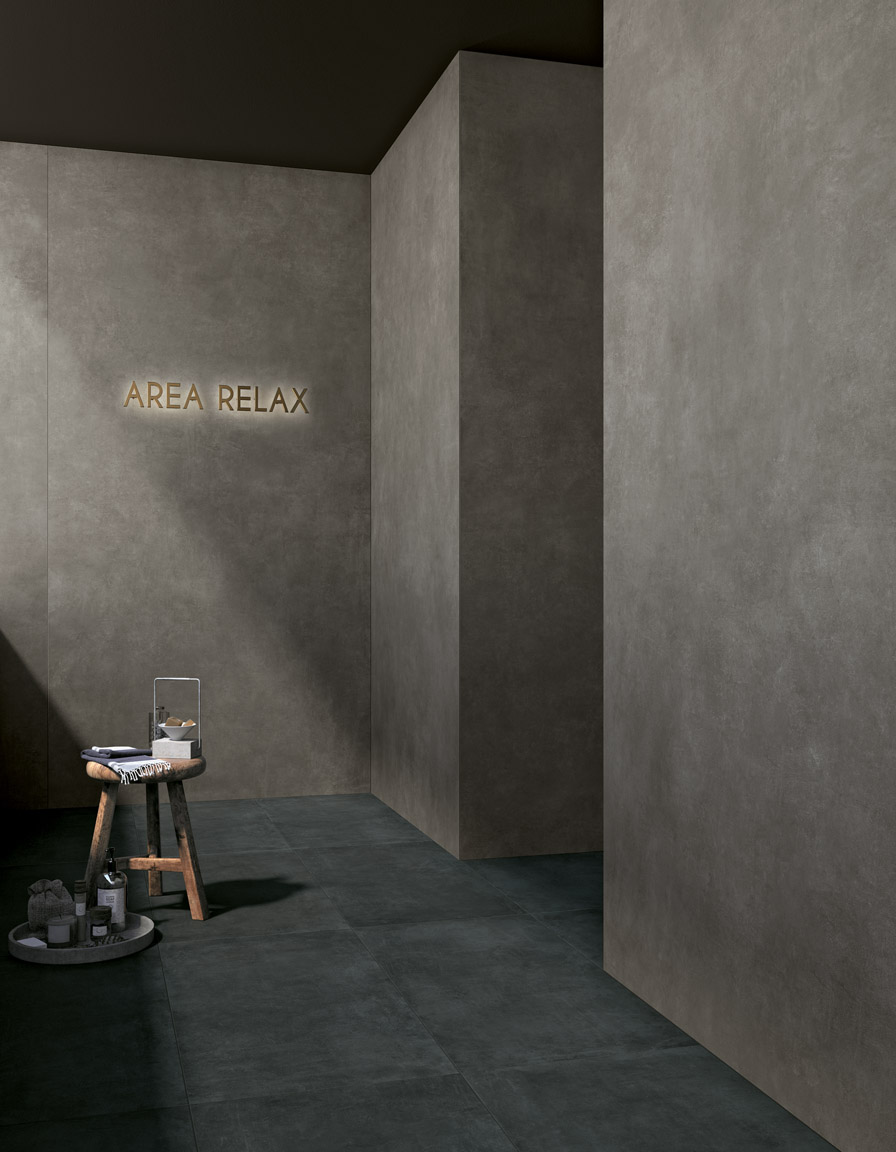 Edge – Polvere (wall), Polvere 20 mm Grip (floor) and Lino (bench)
