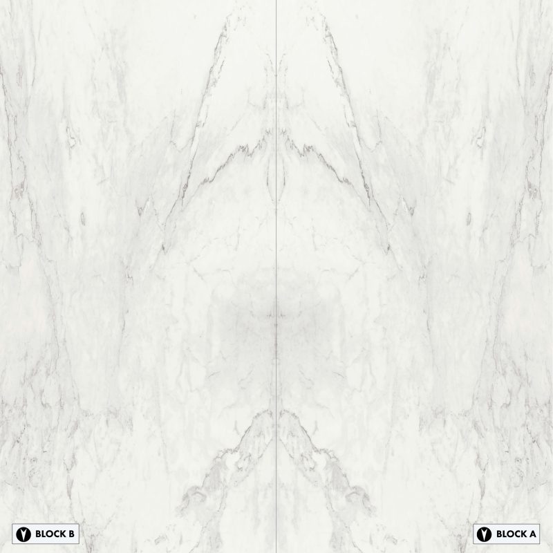Bookmatched slabs are typically supplied in "Block A" and "Block B" matching surfaces, the pattern of which mirror each other. Below you will find layout options for Marble Calacatta Bookmatched. The layouts have been prepared to help you understand which Block, A or B is used to create each combination and which direction the block is facing, north or south. Click on each thumbnail for a closer look.