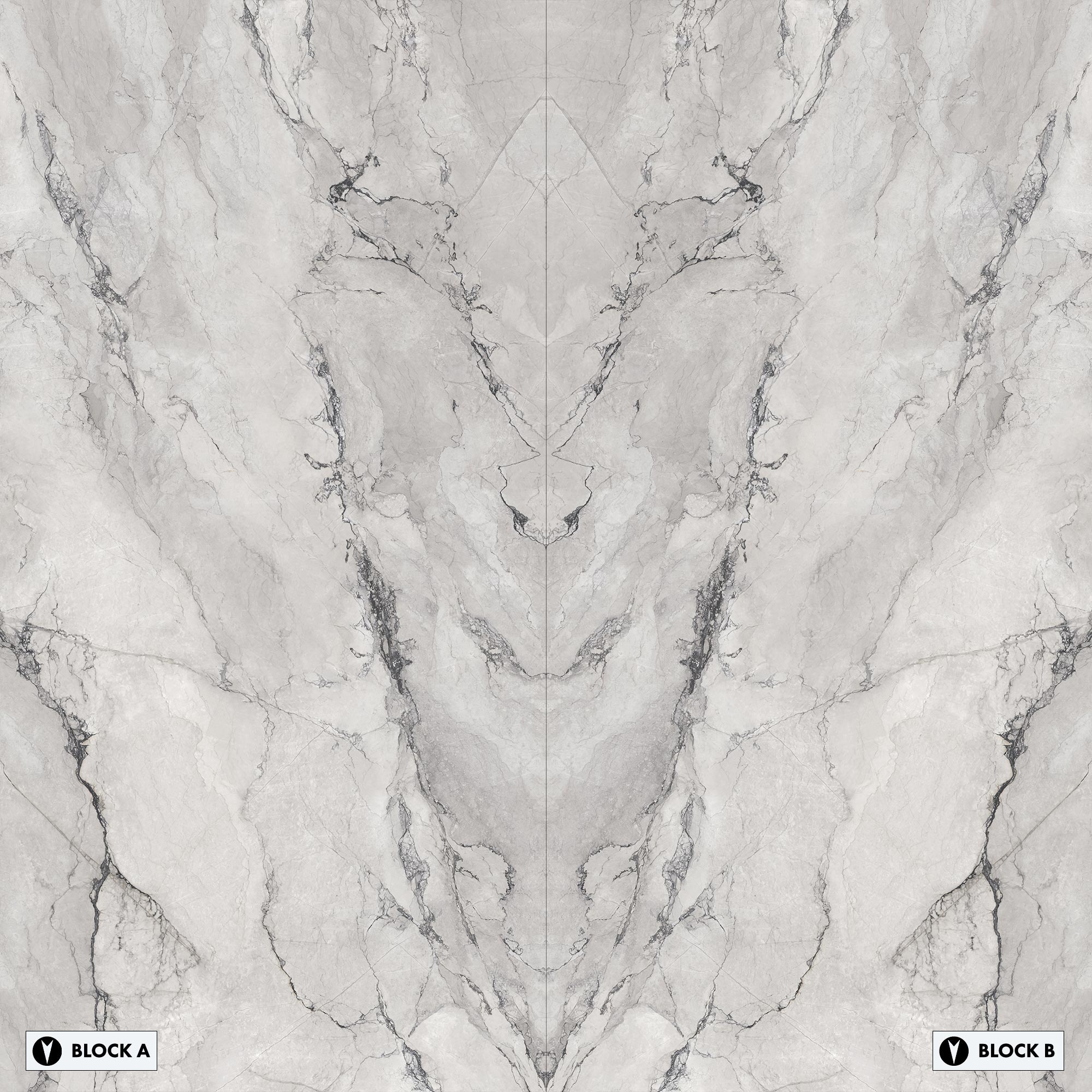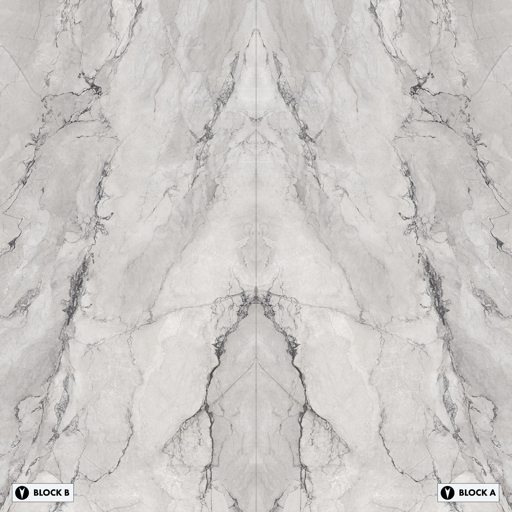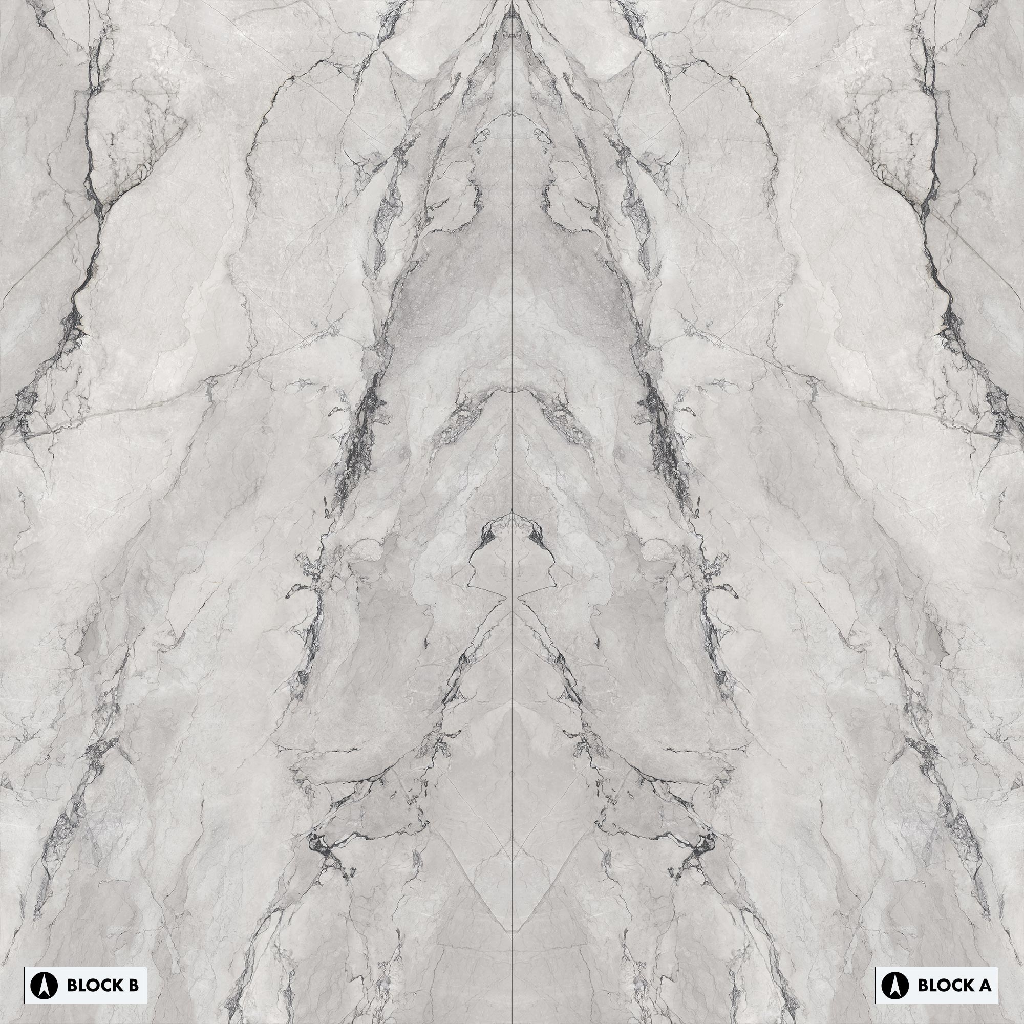 Bookmatched slabs are typically supplied in "Block A" and "Block B" matching surfaces, the pattern of which mirror each other. Below you will find layout options for Michelangelo Bianco Bookmatched. The layouts have been prepared to help you understand which Block, A or B is used to create each combination and which direction the block is facing, north or south. Click on each thumbnail for a closer look.